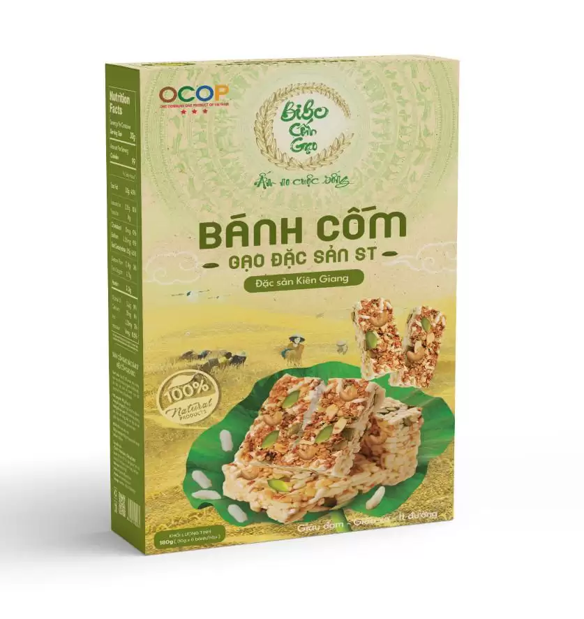 Bánh cốm gạo đặc sản ST Bibo là sản phẩm ẩm thực độc đáo của Việt Nam, chế biến từ gạo đặc sản ST25, hạt gạo ngon nhất thế giới. Được bổ sung hạt bí ngô, hạt điều, hạt mè, rong biển, chanh tươi, và gừng tươi, sản phẩm mang đến hương vị đặc trưng và dinh dưỡng cao. Đóng gói tiện lợi, giữ được lớp cám và dầu gạo quý giá, bánh cốm Bibo là sự kết hợp hoàn hảo giữa truyền thống và hiện đại, là lựa chọn tốt cho mọi người, đặc biệt là những người có lối sống năng động và bận rộn (Feedback).