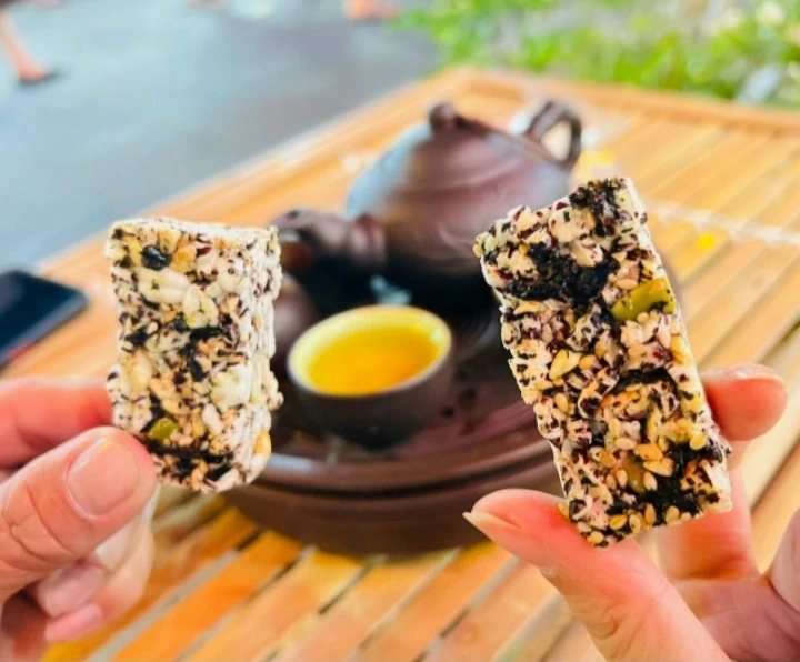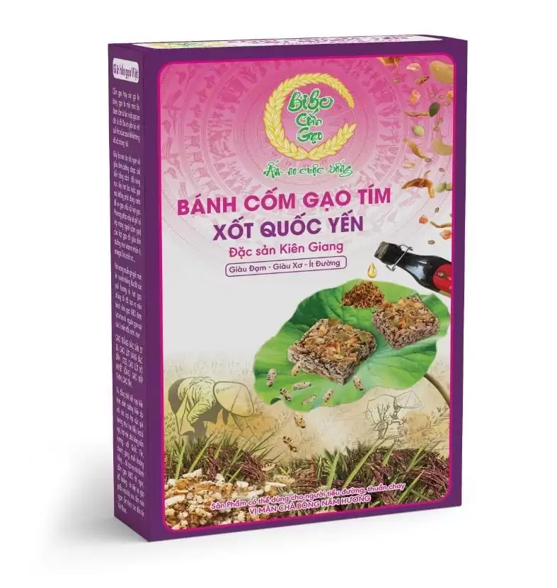 Bánh cốm gạo tím xốt quốc yến Bibo là đặc sản Kiên Giang với thành phần chính từ gạo tím, xốt quốc yến và các nguyên liệu tự nhiên như hạt điều, bí xanh, mè vàng, rong biển, bột sầu riêng. Sản phẩm đóng gói tiện lợi, mỗi thanh 30gr, giữ nguyên hương vị và dinh dưỡng. Bánh phục vụ nhanh chóng, đa dạng dành cho mọi người, thơm ngon tiện lợi và tốt cho sức khỏe (Feedback).