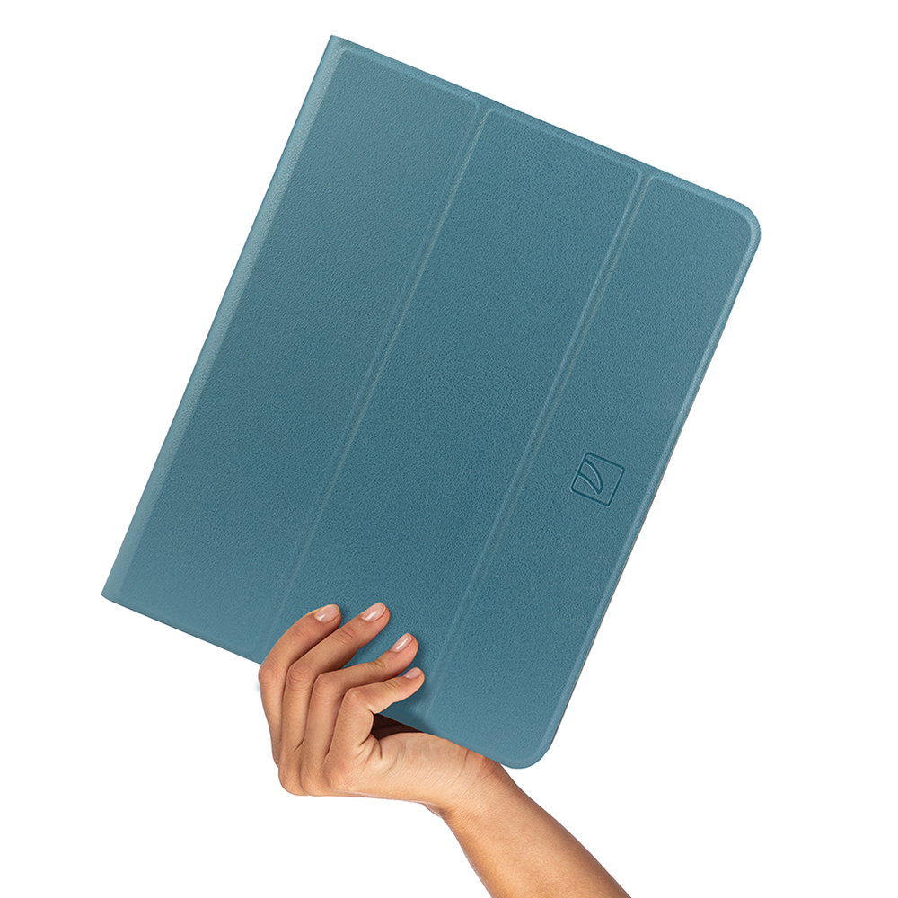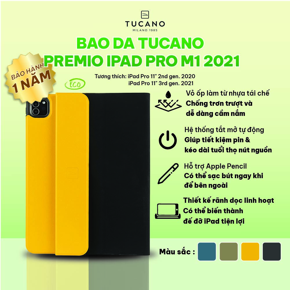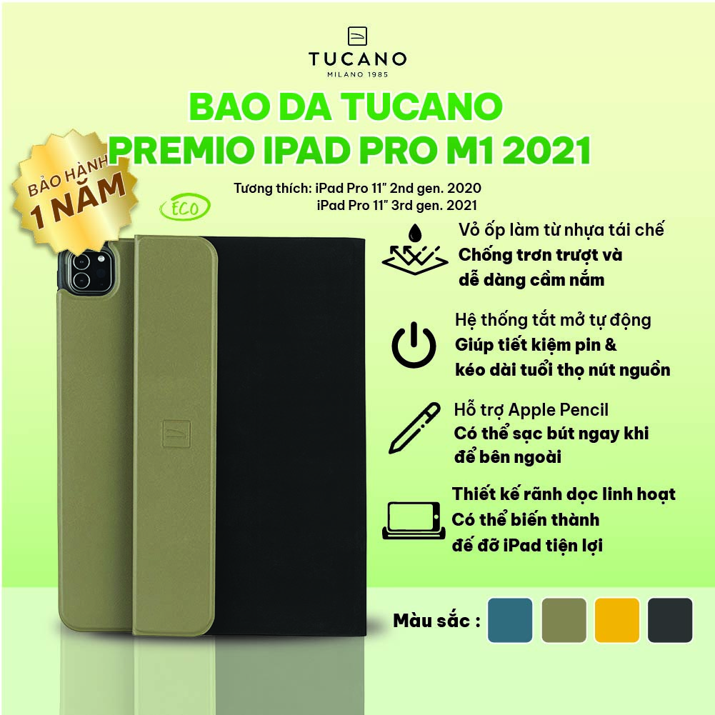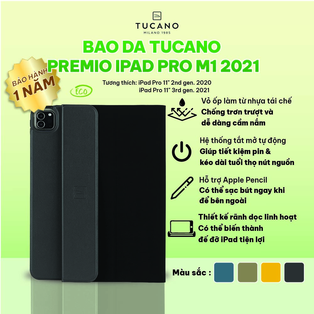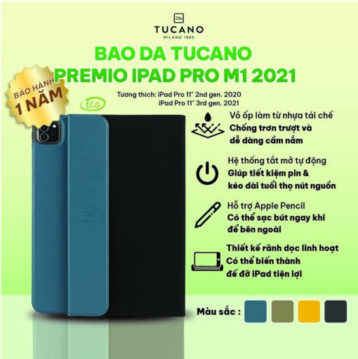 Bao da Tucano Premio cho iPad Pro M1 2021 với chất liệu nhựa tái chế, tạo cảm giác cầm nắm tốt và chống trơn, trượt cho thiết bị. Chế độ tắt mở tự động tiện lợi, cùng khả năng tản nhiệt tốt. Rãnh chạy dọc giúp gập bao da thành giá đỡ linh hoạt. Bao da cũng bảo vệ tốt cho Apple Pencil, với chốt từ tính đảm bảo an toàn khi sạc và không làm ảnh hưởng đến việc sử dụng.
