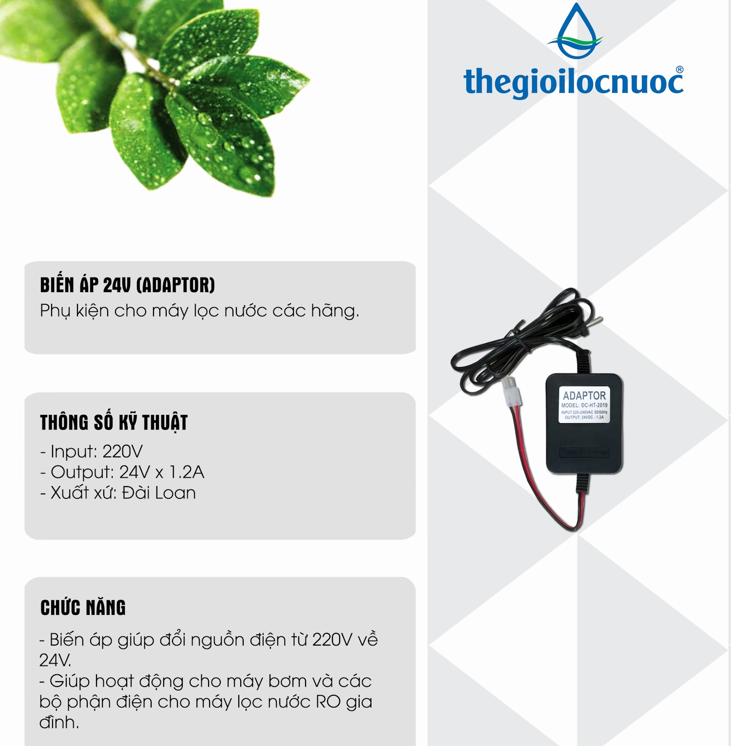 Biến áp 24V (Adaptor) giúp đổi nguồn điện từ 220V về 24V. Giúp hoạt động cho máy bơm và các bộ phận điện cho máy lọc nước RO gia đình.