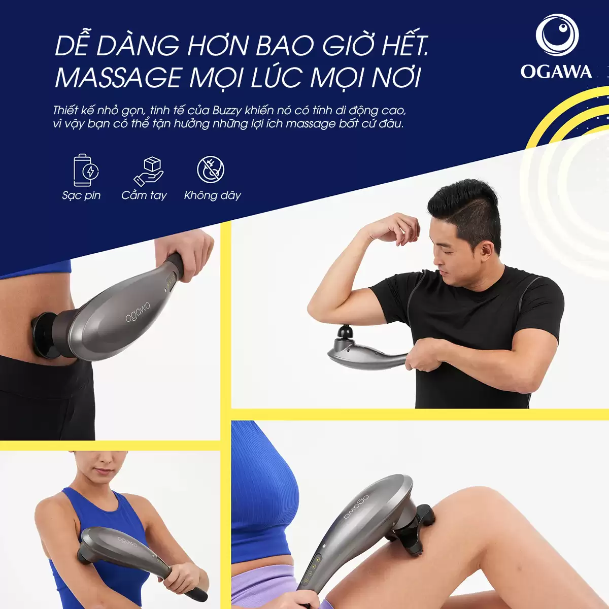 Bộ đôi sức khỏe – nhân đôi trải nghiệm Ogawa bao gồm máy massage cầm tay Buzzy và máy massage mắt đa năng EM-X. Giúp bạn có những giây phút thư giãn cả về thể chất lẫn tinh thần. Giảm nhức mỏi cơ thể (từ cổ vai gáy, lưng trên, thắt lưng, chân tay,.. đến vùng mắt, mũi, đầu) một cách hiệu quả và nhanh chóng sau 15 phút massage. Điều tiết lưu thông máu, giảm căng thẳng và thư giãn mắt bằng các chuyển động nhịp nhàng, giúp tinh thần được sảng khoái hơn.