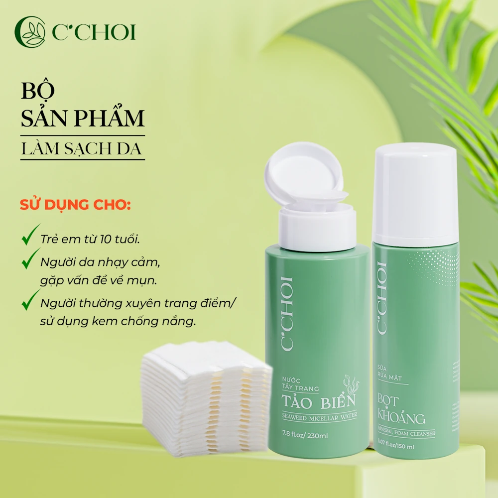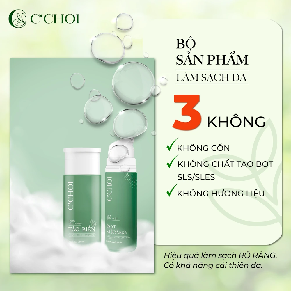 Bộ sản phẩm làm sạch da C’Choi 3 không: không cồn, không chất tạo bọt SLS/SLES, không hương liệu: