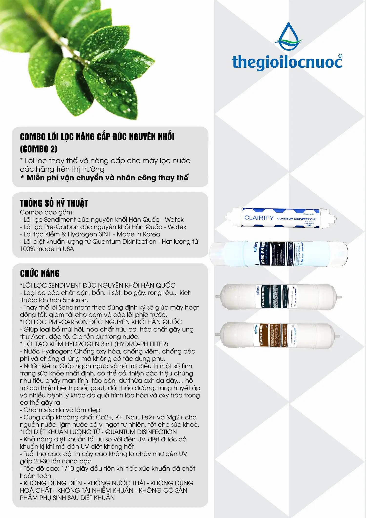Combo lõi lọc Watek nâng cấp đúc nguyên khối là một sản phẩm đa chức năng của thương hiệu Watek. Combo bao gồm các lõi lọc đúc nguyên khối hàng đầu từ Hàn Quốc và Canada, với các tính năng và ứng dụng khác nhau: