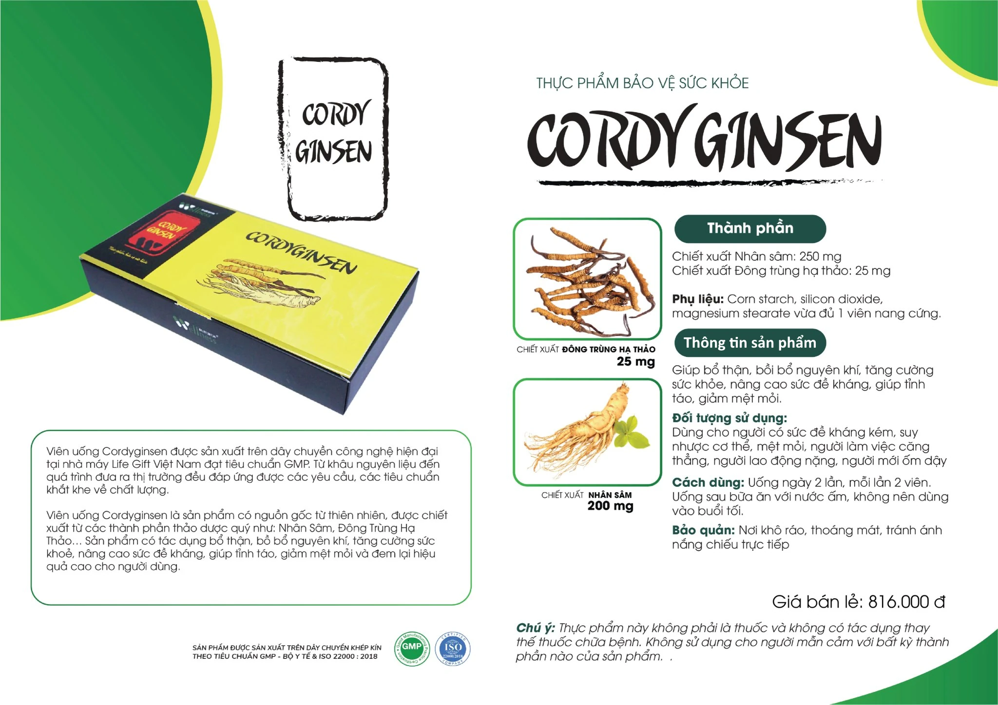 Viên đông trùng nhân sâm tăng cường sinh lý nam giới CordyGinsen giúp bổ thận, bồi bổ nguyên khí, tăng cường sức khỏe, nâng cao sức đề kháng, giúp tỉnh táo, giảm mệt mỏi. Sự kết hợp diệu kỳ giữa dược liệu quý Nhân Sâm và Đông Trùng Hạ Thảo tạo nên một Cordyginsen sở hữa nhiều dưỡng chất thiết yếu tốt cho sức khoẻ (Feedback).