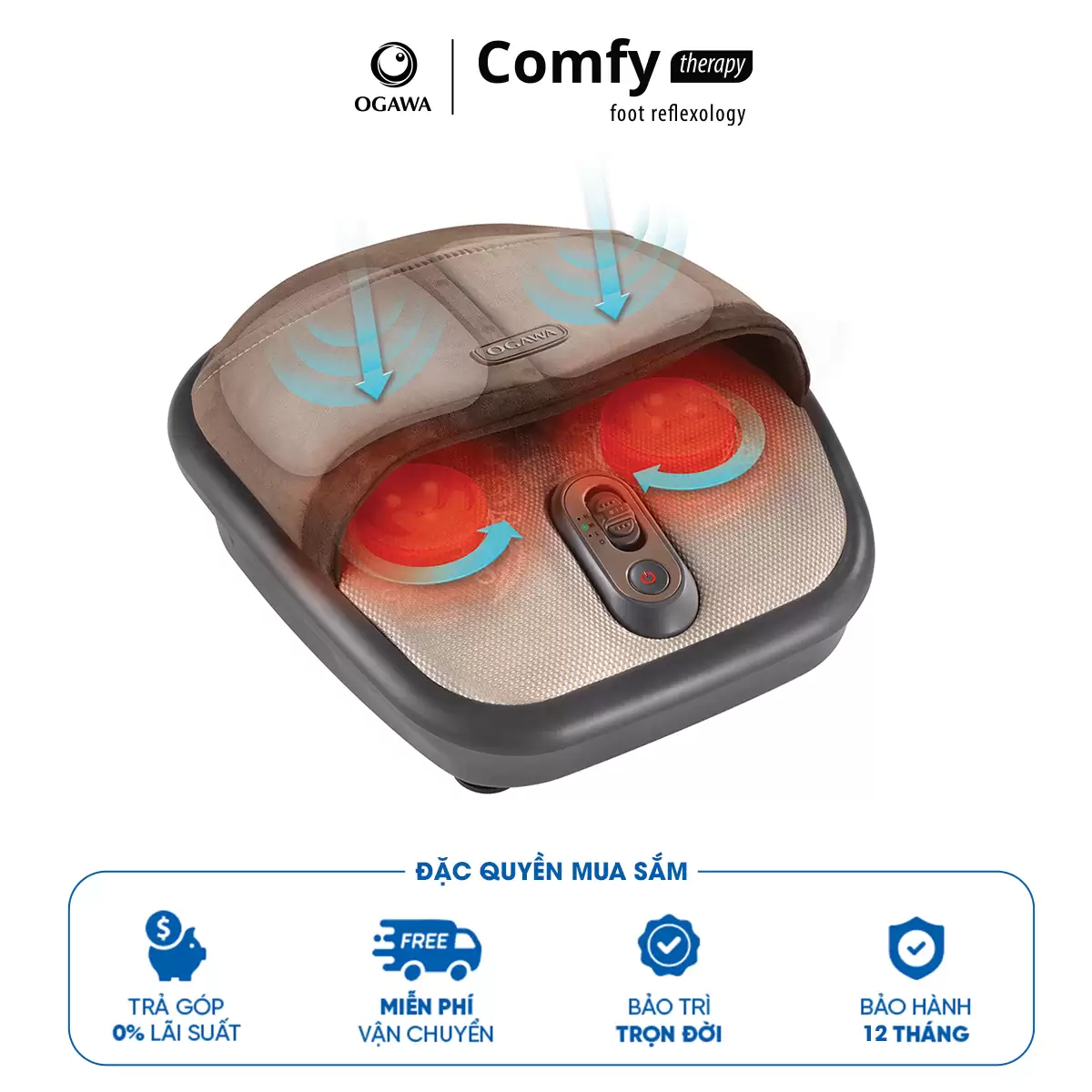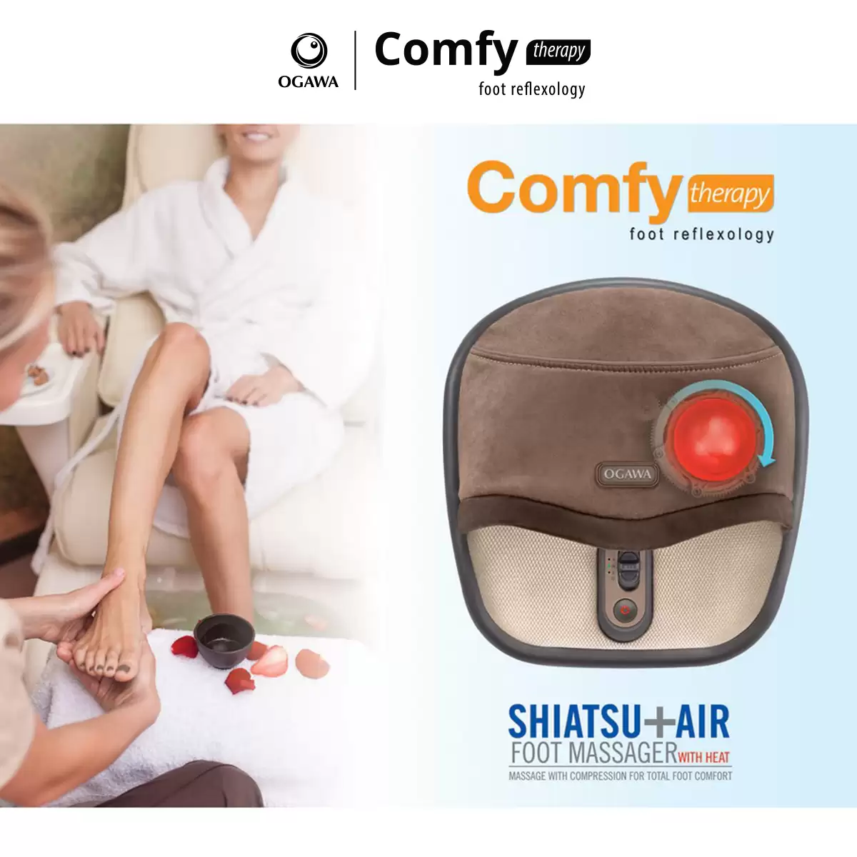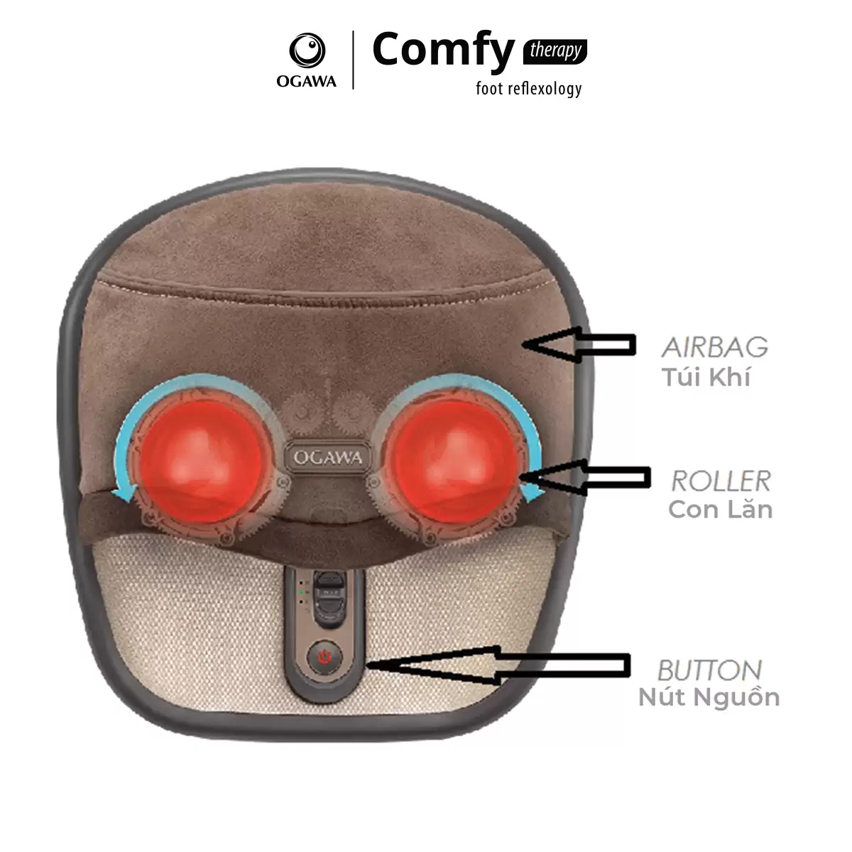 Dụng cụ Massage chân ấn huyệt & xoa bóp bàn chân Comfy Therapy – Tích hợp con lăn nhiệt ấn huyệt sâu vào lòng bàn chân, giúp thúc đẩy lưu thông máu, giải tỏa căng thẳng thông qua hệ thống các huyệt đạo lòng bàn chân. Túi khí xoa bóp liên tục giúp xoa dịu cơn nhức mỏi một cách hiệu quả.