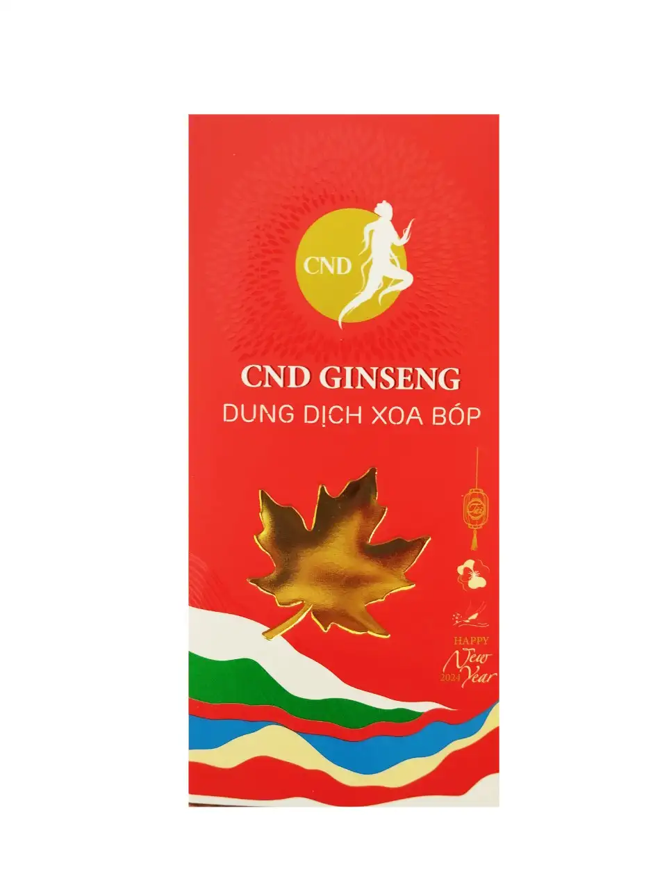 Dung dịch xoa bóp CND Ginseng được sản xuất tại Công Ty Cổ Phần Dược Laterre France, Việt Nam, hỗ trợ cải thiện đau nhức cơ xương khớp mãn tính. Dùng bằng cách xoa bóp lên vùng đau từ 1-10 phút, 2-3 lần mỗi ngày. Dung dịch có thành phần chính bao gồm cao bột nhân sâm, cao bột ba kích, cao bột đương quy, cao bột kỷ tử.