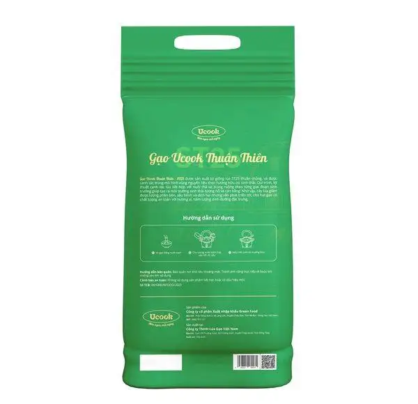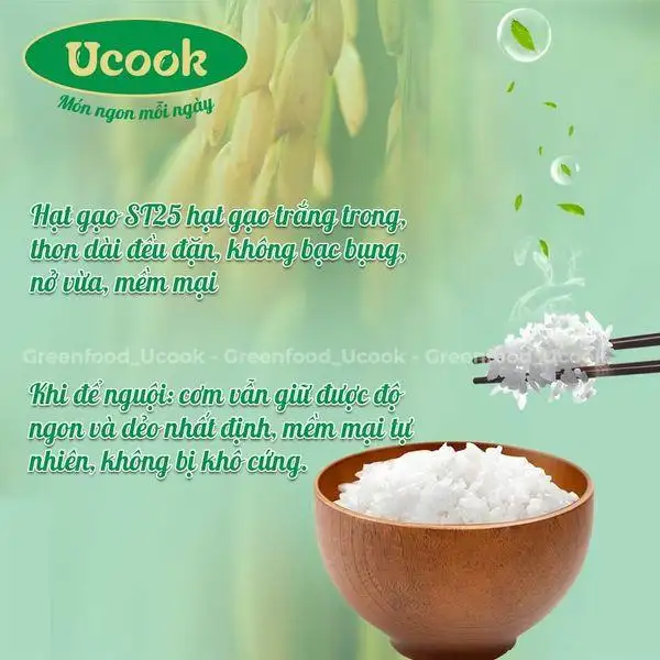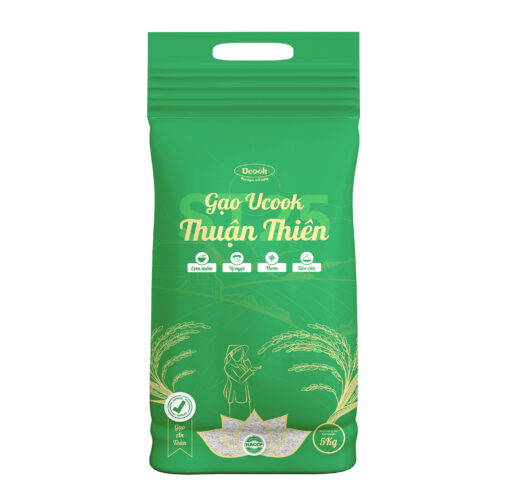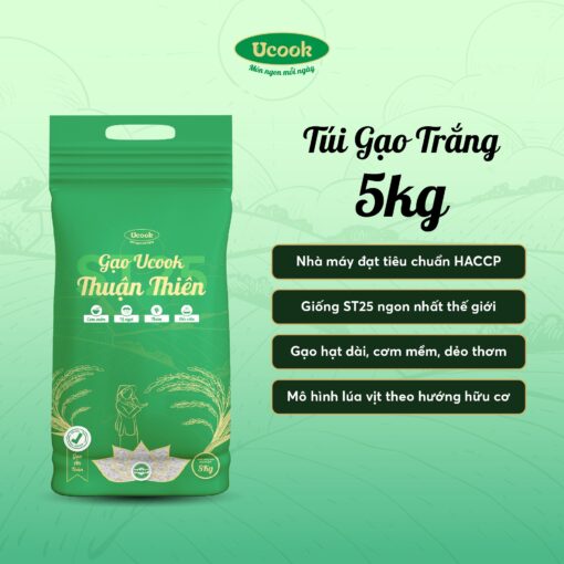 Gạo lúa vịt ST25 Thuận Thiên là sản phẩm của thương hiệu Ucook, đóng gói trong túi 5kg, có hạn sử dụng 12 tháng. Thành phần chính là 100% gạo trắng ST25. Cách bảo quản bao gồm đặt nơi khô ráo, thoáng mát và tránh ánh nắng mặt trời. Để nấu cơm ngon, cần nấu với ít nước, không cần xới xáo. Gạo ST25 có hàm lượng đạm cao, thích hợp cho người bệnh tiểu đường. Sản phẩm không nên sử dụng nếu có dấu hiệu hư hỏng.