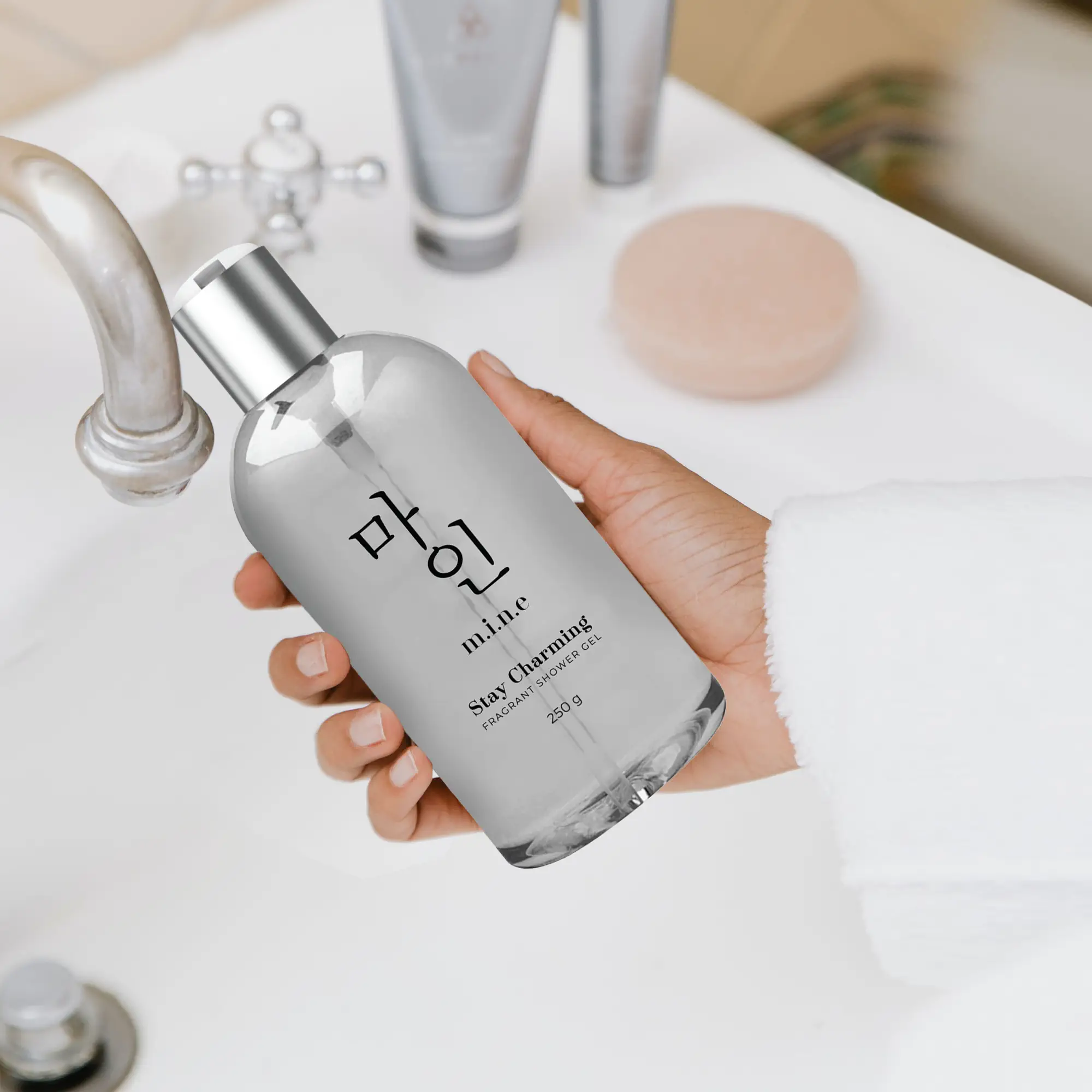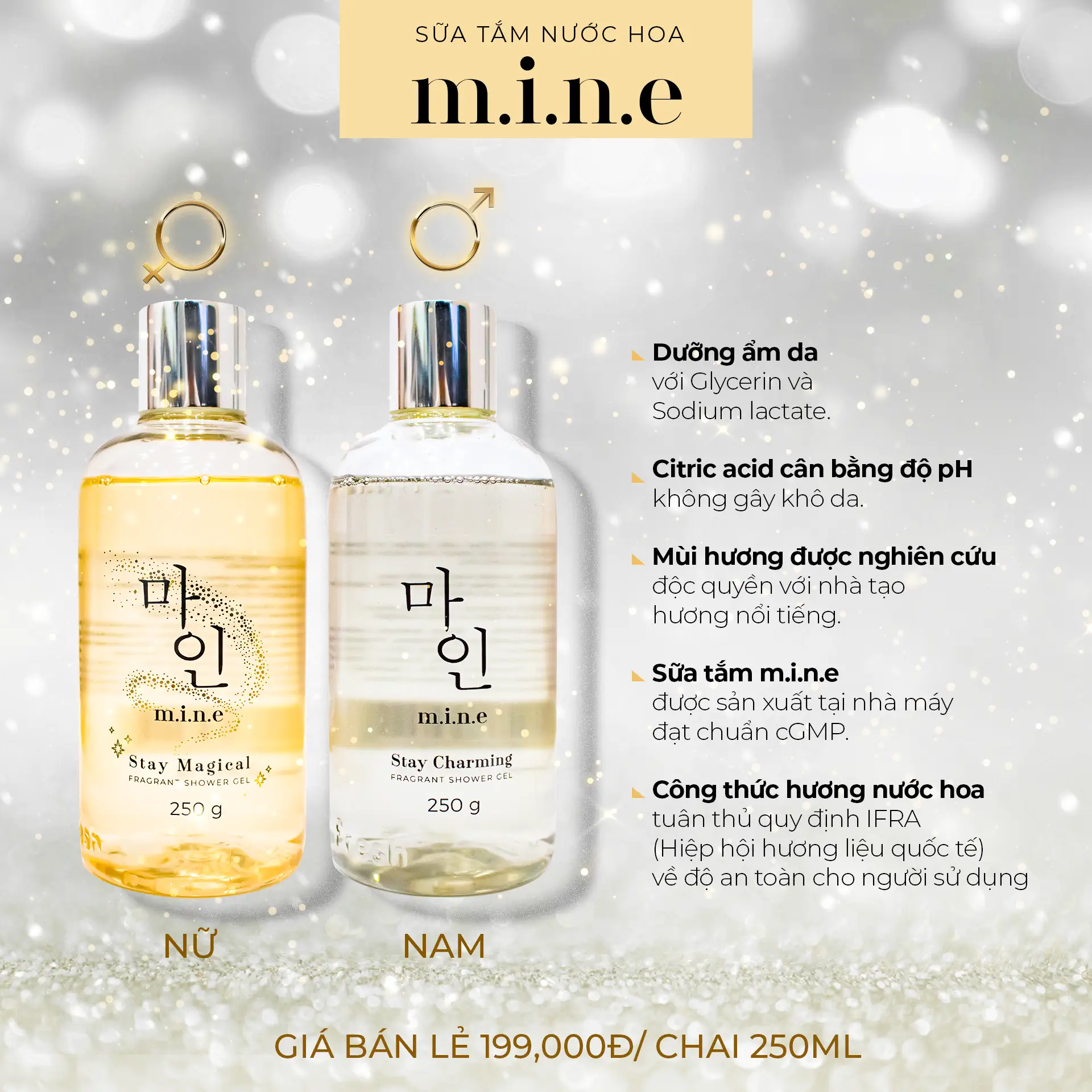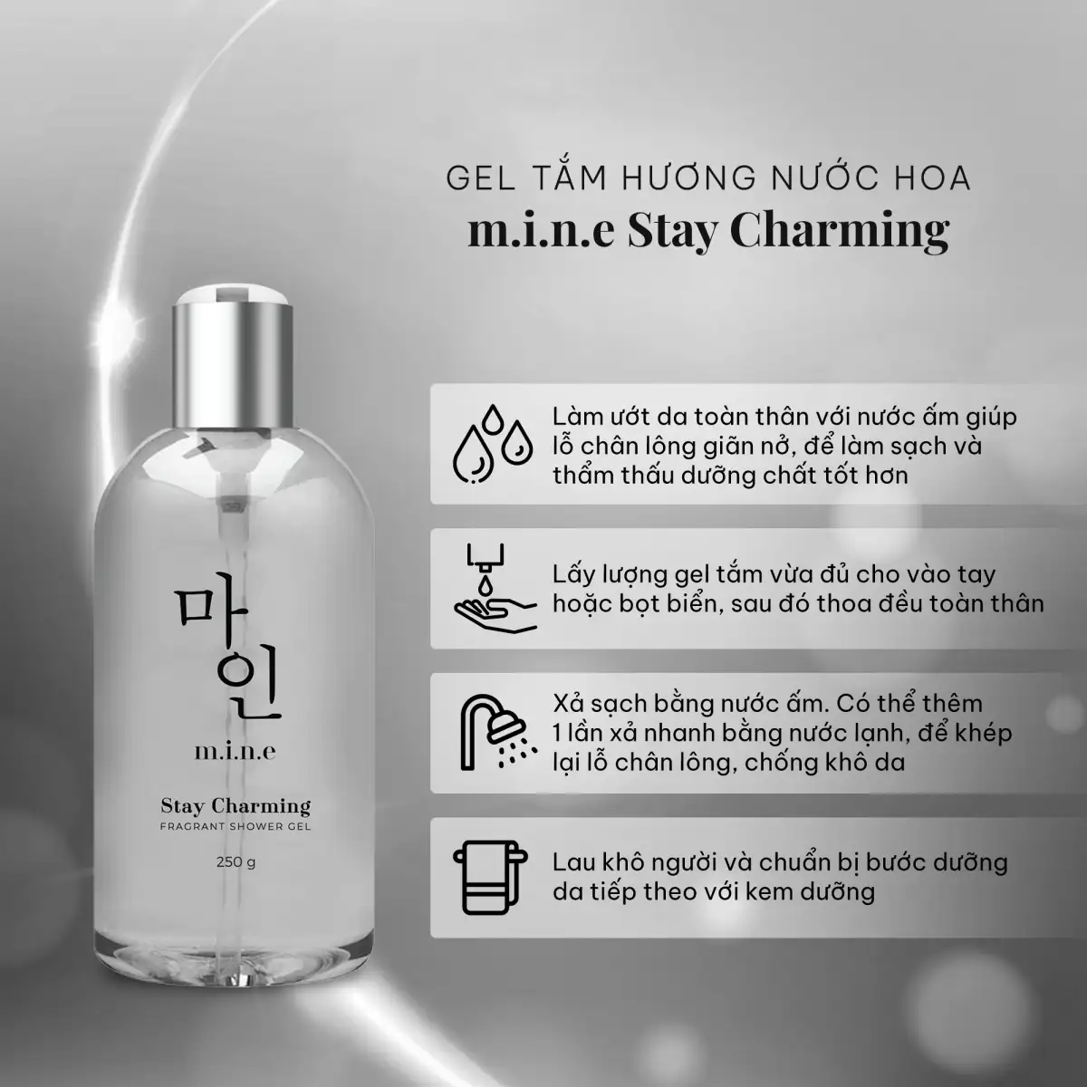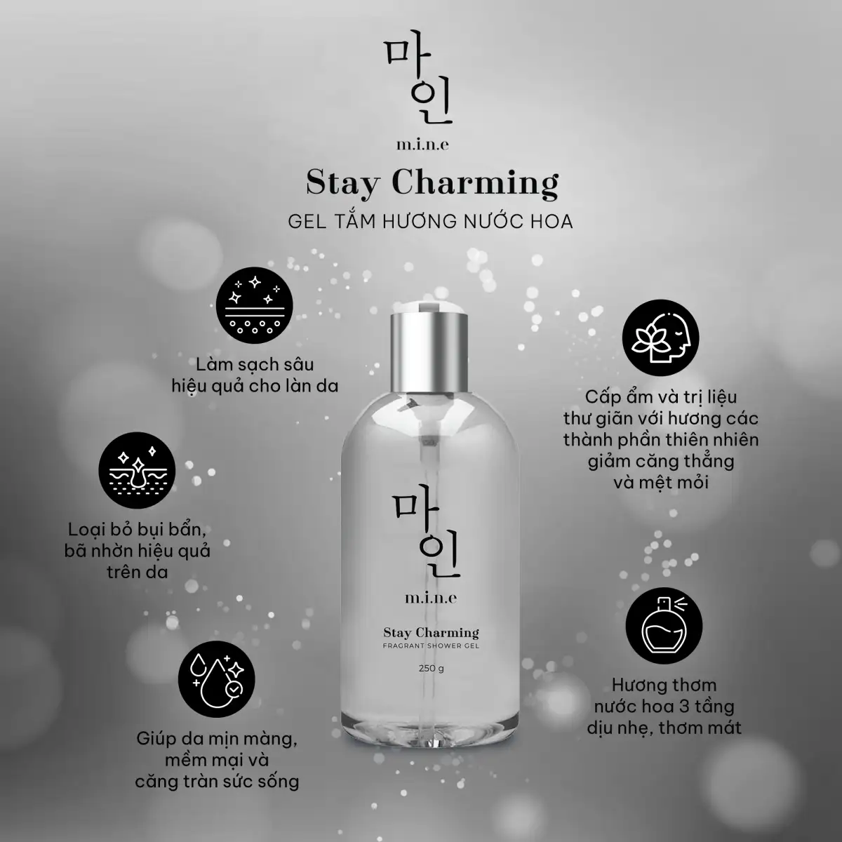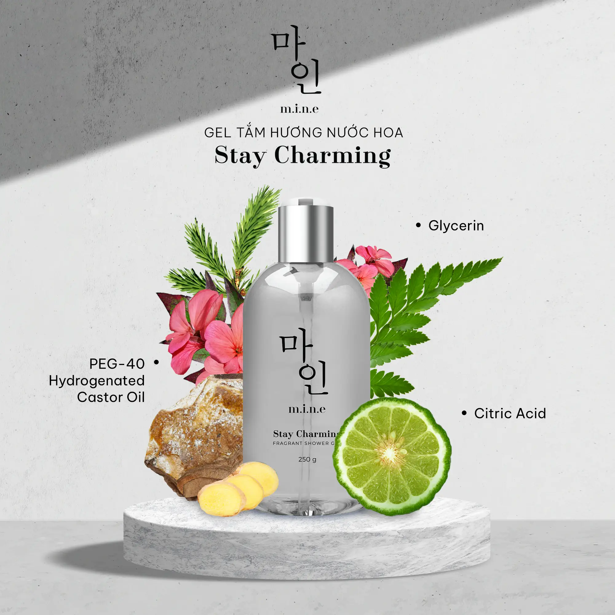 Gel tắm hương nước hoa Mine Stay Charming: Hương thơm ngọt ấm của Cam xen kẽ với mùi hương tươi mát của thảo mộc thiên nhiên. Hương thơm mát cùng thành phần Citric Acid và Glycerin dưỡng ẩm cho da hiệu quả, mmang đến liệu pháp thư giãn bằng hương thơm giúp giảm căng thẳng và mệt mỏi (Feedback).