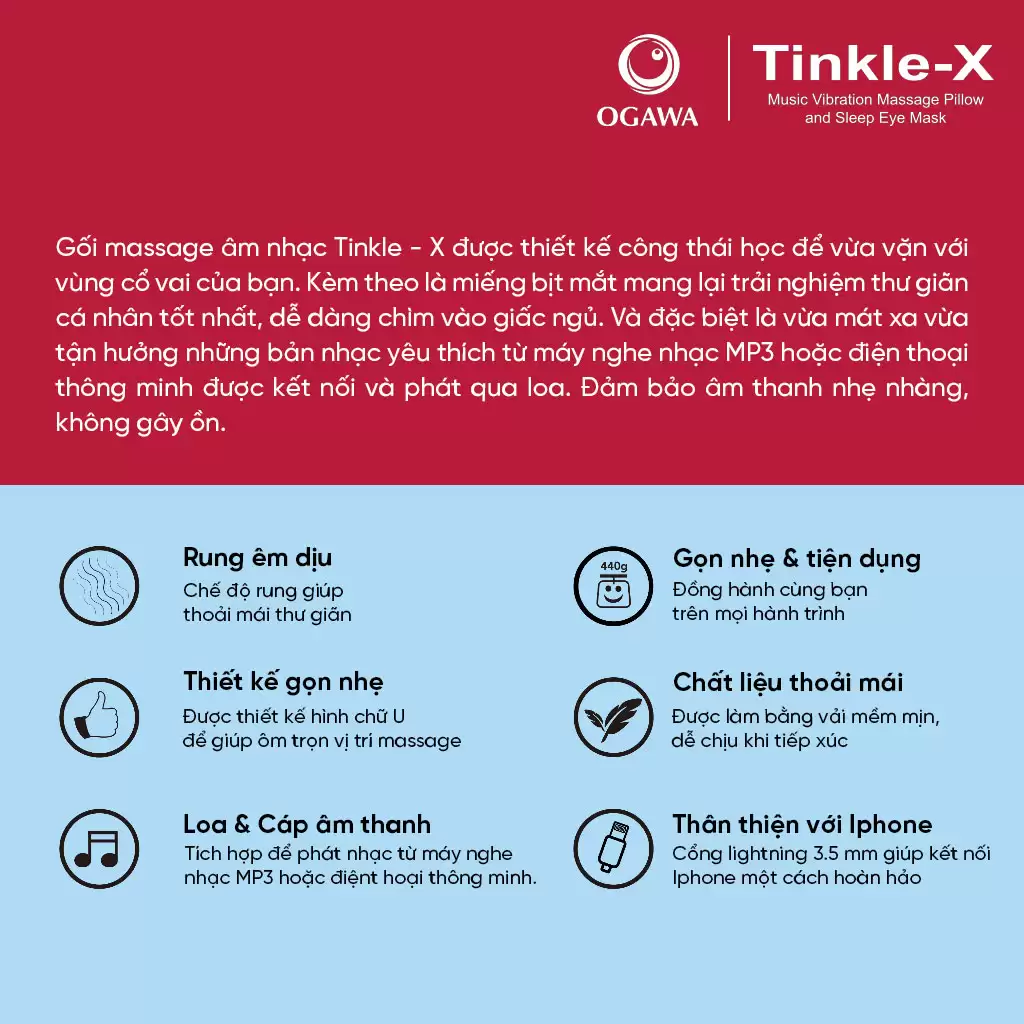 Gối massage âm nhạc kèm miếng che mắt ngủ (OL-0502X) – Ogawa Tinkle Touch – X (OL-0502X) and sleep Eye Mask – Gối Massage Cổ cùng âm nhạc OGAWA Tinkle Touch – X có thiết kế đặc biệt với chức năng vừa thư giãn vừa massage, nên bạn có thể tùy ý sử dụng từng chức năng hay là kết hợp 2 chức năng đều được, giúp bạn thư giản và giảm đau nhức giúp bạn tập trung vào công việc tốt hơn. Thiết kế tinh tế hiện đại với chất liệu an toàn dễ giặt ủi, thực sự là một người bạn tin cậy cho mọi gia đình. Đặc biệt, gối còn được kèm theo miếng bịt mắt giúp bạn chìm vào giấc ngủ một cách thoái mái