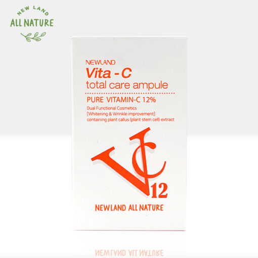 Tinh chất cô đặc dưỡng da trắng sáng Vita-C Total Care Ampule Newland có chứa hàm lượng 12 % vitamin C nguyên chất; thành phần “vitamin peptide” và chứa chiết xuất từ tế bào gốc thực vật có tác dụng kích hoạt các tế bào da giúp tế bào da luôn khỏe mạnh; ức chế sắc tố trên da hỗ trợ làm mờ các đốm nâu hoặc cải thiện vùng da ửng đỏ, giúp ngăn ngừa lão hóa, dưỡng sáng, làm đều màu da và cải thiện nếp nhăn.