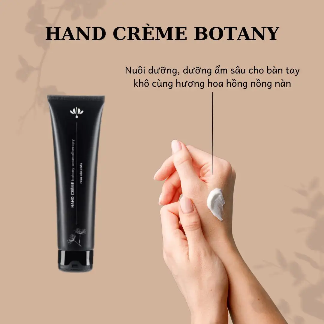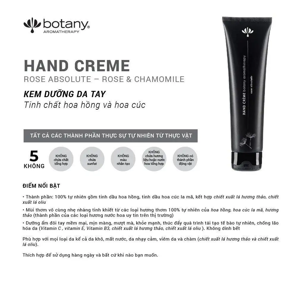 KEM DƯỠNG DA TAY BOTANY – HAND CRÈME Tinh dầu hoa hồng Hữu cơ – không chứa sulfate – không chất tạo màu nhân tạo – không chất hương liệu hoặc nước hoa nhân tạo – không chứa thành phần từ động vật.