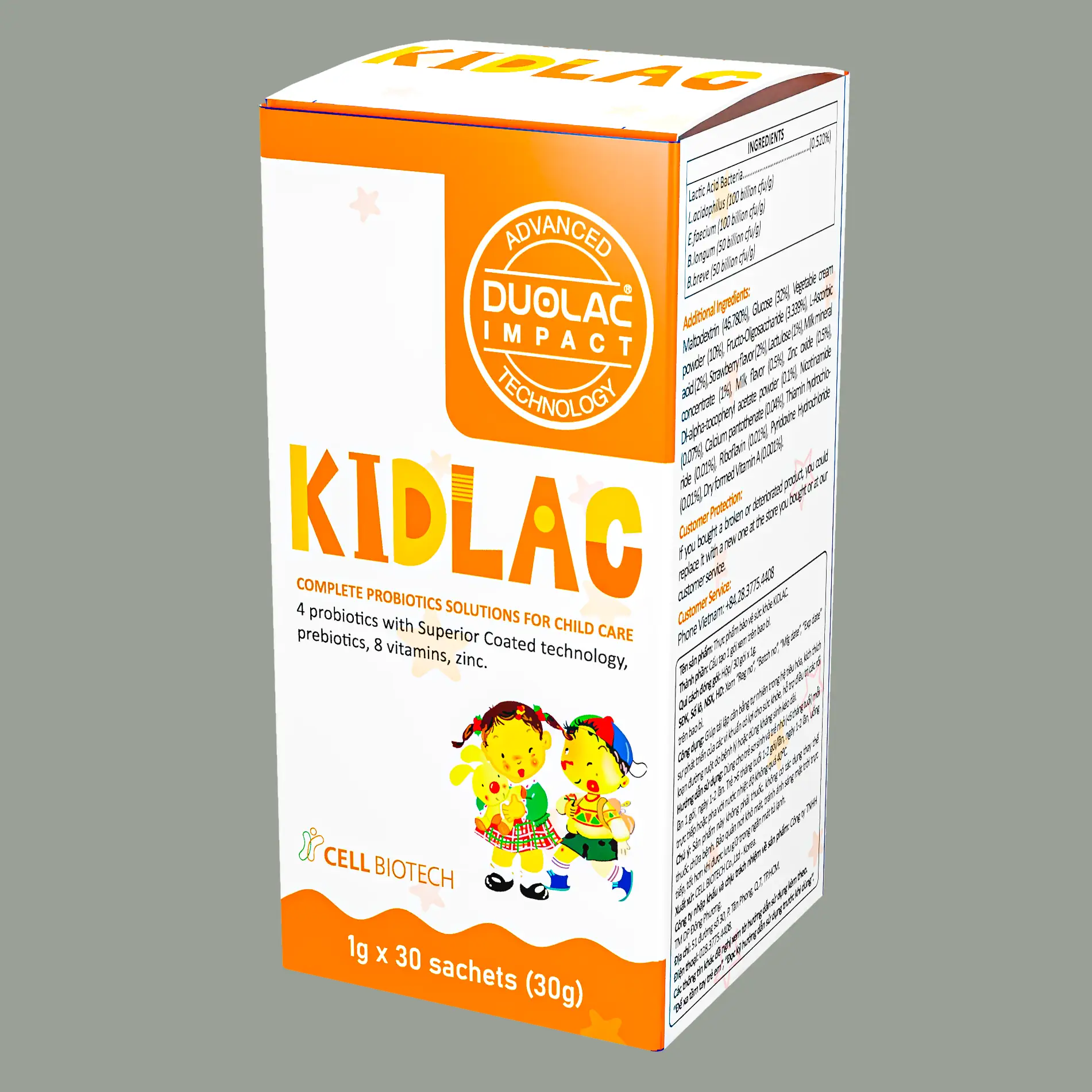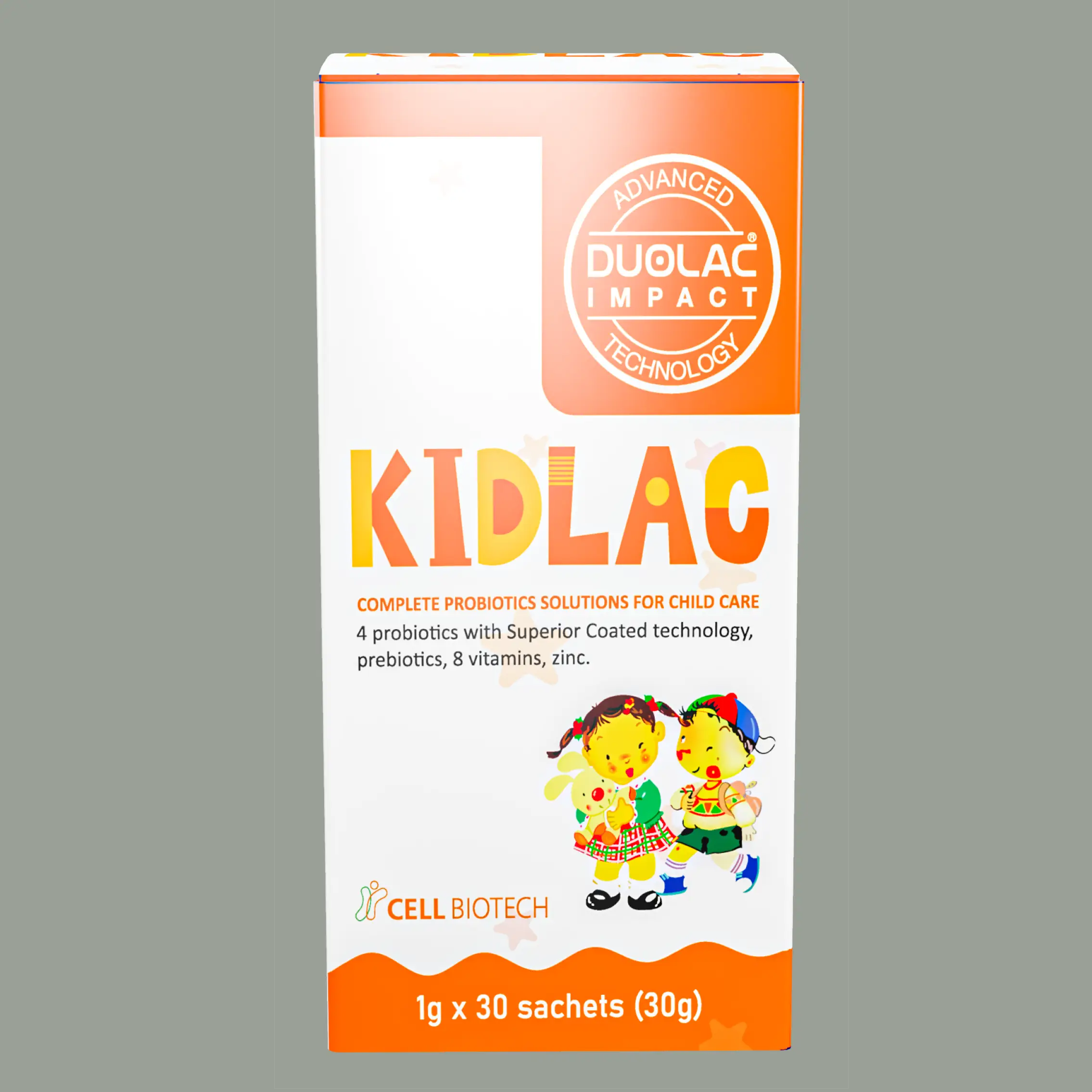 Công thức đa chủng hiệp lực gia tăng tác dụng probiotic (Symbiotic), từ 4 chủng thích hợp trẻ sơ sinh đã chứng minh an toàn và hiệu quả, đã được đăng ký bản quyền tại GenBank bởi công ty Cell Biotech. 4 Probiotic Superior Coated, Prebiotic, 8 Vitamin và Kẽm. Kidlac thích hợp dùng cho trẻ từ sơ sinh đến trẻ nhỏ, trẻ bị các triệu chứng bệnh đường ruột cấp tính – mãn tính thường gặp. Kidlac giúp cân bằng đường ruột tự nhiên, tăng cường chức năng tiêu hóa, dinh dưỡng, hấp thu và miễn dịch.