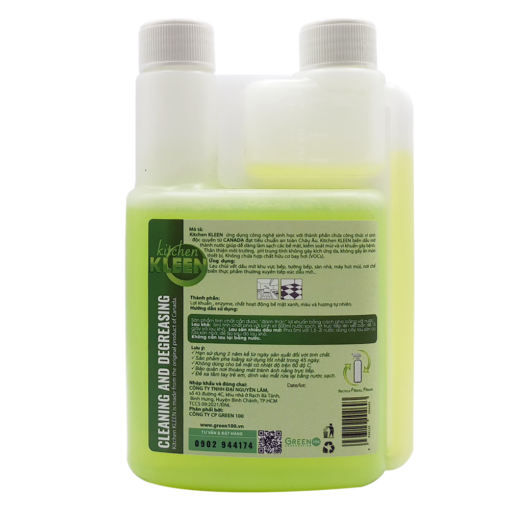 Bộ vi sinh lau chùi dầu mỡ Kitchen KLEEN ứng dụng công nghệ sinh học với thành phần chứa công thức vi sinh độc quyền từ CANADA đạt tiêu chuẩn an toàn Châu Âu. Kitchen KLEEN biến dầu mỡ thành nước giúp dễ dàng làm sạch các bề mặt, kiểm soát mùi và vi khuẩn gây bệnh. Thân thiện môi trường. pH trung tính không gây kích ứng da, không gây ăn mòn thiết bị. Không chứa hợp chất hữu cơ bay hơi (VOCs).