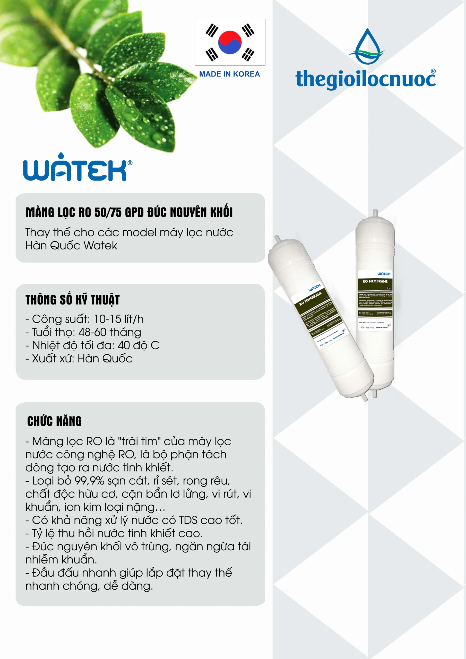 Màng lọc RO là “trái tim” của máy lọc nước công nghệ RO, là bộ phận tách dòng tạo ra nước tinh khiết. Màng lọc RO Hàn Quốc 50/75 GPD Loại bỏ 99,9% sạn cát, rỉ sét, rong rêu, chất độc hữu cơ, cặn bẩn lơ lửng, vi rút, vi khuẩn, ion kim loại nặng… Có khả năng xử lý nước có TDS cao tốt. Tỷ lệ thu hồi nước tinh khiết cao. Đúc nguyên khối vô trùng, ngăn ngừa tái nhiễm khuẩn. Đầu đấu nhanh giúp lắp đặt thay thế nhanh chóng, dễ dàng.