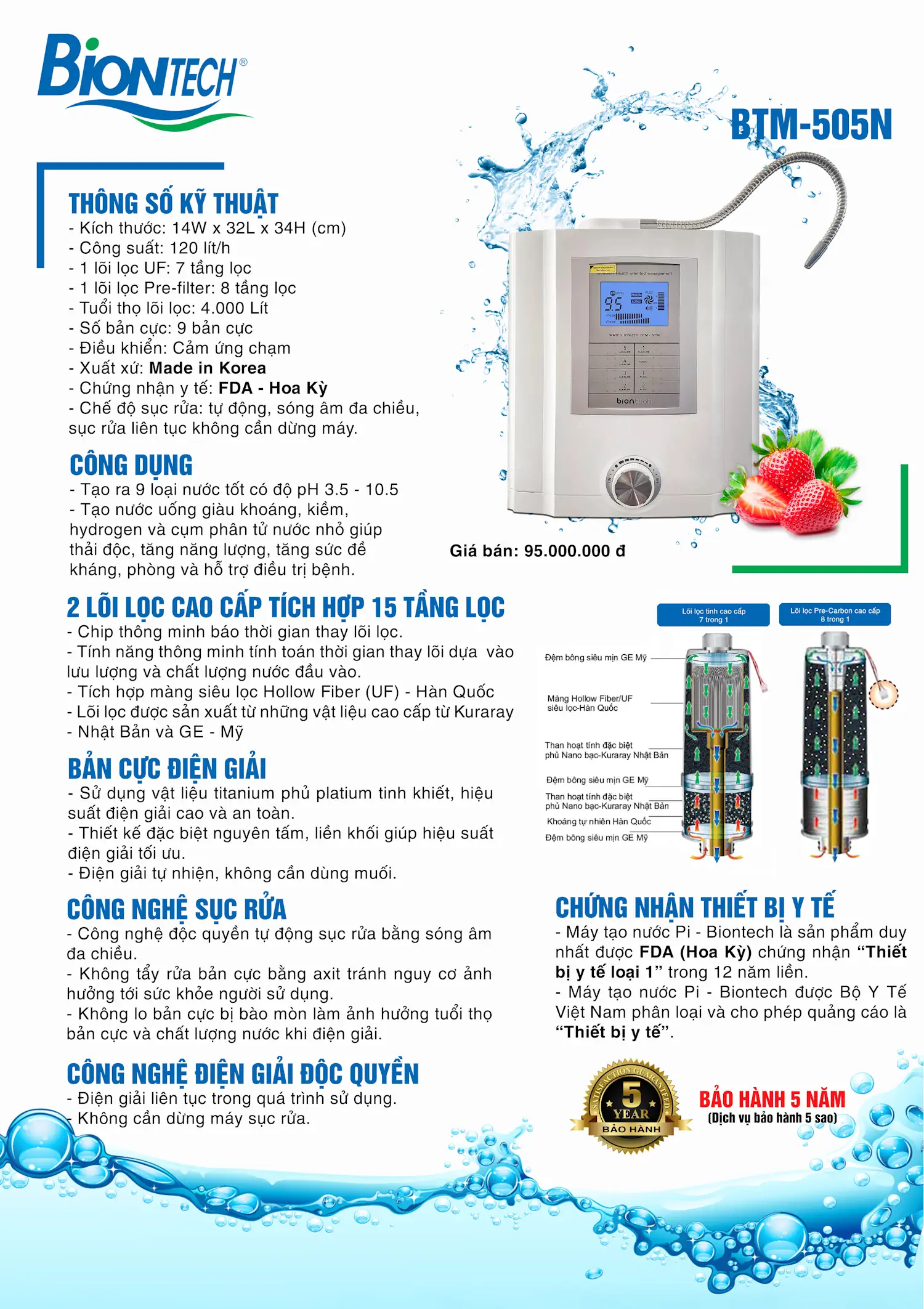 Máy BIONTECH model BTM-505N có màn hình LCD báo chỉ số PH, hiển thị thời gian thay lõi. 2 lõi lọc tinh. Chế độ tự động sục rửa sóng âm đa chiều, cảnh báo các chế độ nước bằng âm thanh, giọng nói, tạo ra 9 loại nước,…