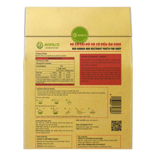 Mì củ cải đỏ và củ dền hữu cơ Anpaso tự hào là sản phẩm mì rau củ hữu cơ chuẩn 5K đầu tiên tại Việt Nam, được cấp chứng nhận hữu cơ USDA của Bộ Nông Nghiệp Hoa Kỳ và FDA Hoa Kì về An toàn thực phẩm.