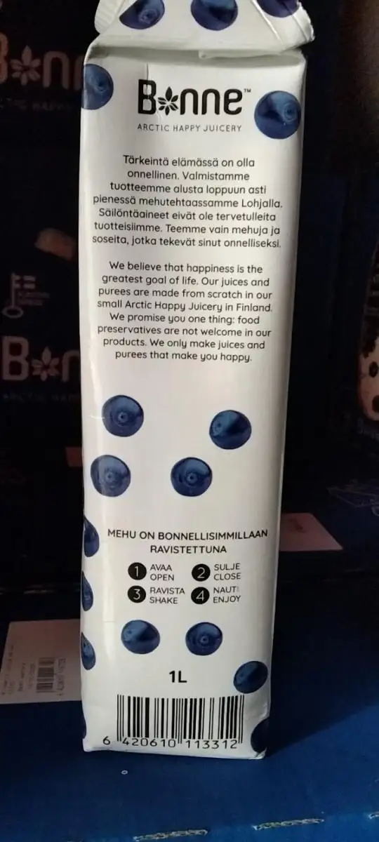 Nước ép Việt Quất rừng và nước suối tinh khiết, giữ nguyên mùi vị trái cây thật, đóng gói tetrapak không chất bảo quản, không đường, không phụ gia. Giàu Vitamin, chất xơ tốt từ trái cây hỗ trợ tạo enzyme tự nhiên cho đường ruột, thúc đẩy quá trình tiêu hóa và hấp thụ chất dinh dưỡng qua thành đường ruột tốt nhất. Giúp làm sáng da và chống táo bón nhanh chóng và tiện dụng. Ngoài ra cung cấp một lượng lớn chất xơ, vitamin, chất chống oxy hóa vượt bậc.