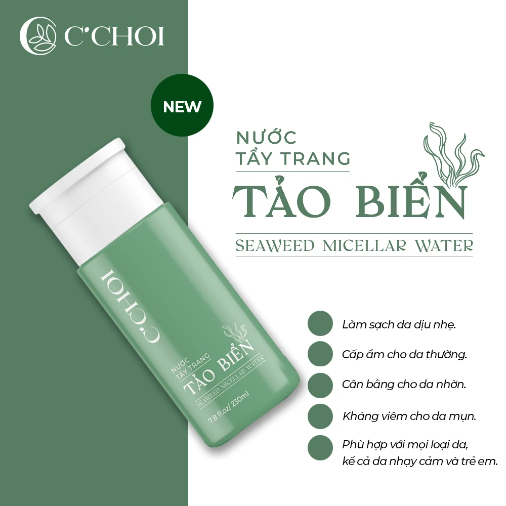 Nước Tẩy Trang Tảo Biển C’Choi – Seeweed Micellar Water là sản phẩm làm sạch da mặt hiệu quả. Chứa dầu Babassu từ cây cọ Babassu ở Nam Mỹ, sản phẩm giúp loại bỏ trang điểm và bụi bẩn dễ dàng mà không làm da nhờn rít. Ngoài ra, nước tẩy trang còn chứa chiết xuất tảo biển, chiết xuất dưa leo, vitamin, và khoáng chất giúp cải thiện làn da, làm dịu và giảm tiết dầu, đồng thời duy trì môi trường pH lý tưởng cho da.