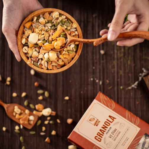 Premium Granola Happy Nuts với thành phần chính là yến mạch kết hợp với các loại hạt dinh dưỡng và trái cây sấy. Với hương vị thơm ngon được rất nhiều bạn yêu thích và lựa chọn sử dụng. Hiện nay, chế độ ăn uống lành mạnh đang là một trào lưu phổ biến rộng rãi, tập trung vào những loại thực phẩm nhiều chất xơ, nguyên vị, nhiều chất béo tốt và tiêu hóa chậm, điển hình là yến mạch và các loại hạt.