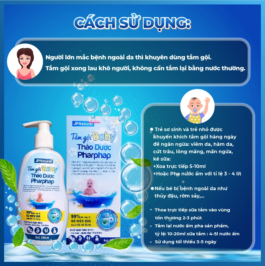 Sản phẩm tắm gội baby thảo dược Pharpharp 2in1 Jpnatural chứa 9 loại thảo mộc cổ truyền và Nano Bạc kháng khuẩn, giúp rửa sạch, giữ ẩm và bảo vệ da của bé khỏi các vấn đề như rôm sảy, lở ngứa, lông măng, thủy đậu, mụn nhọt, hăm da. Sản phẩm an toàn cho trẻ và người lớn có da nhạy cảm.