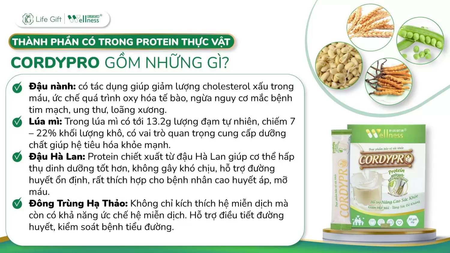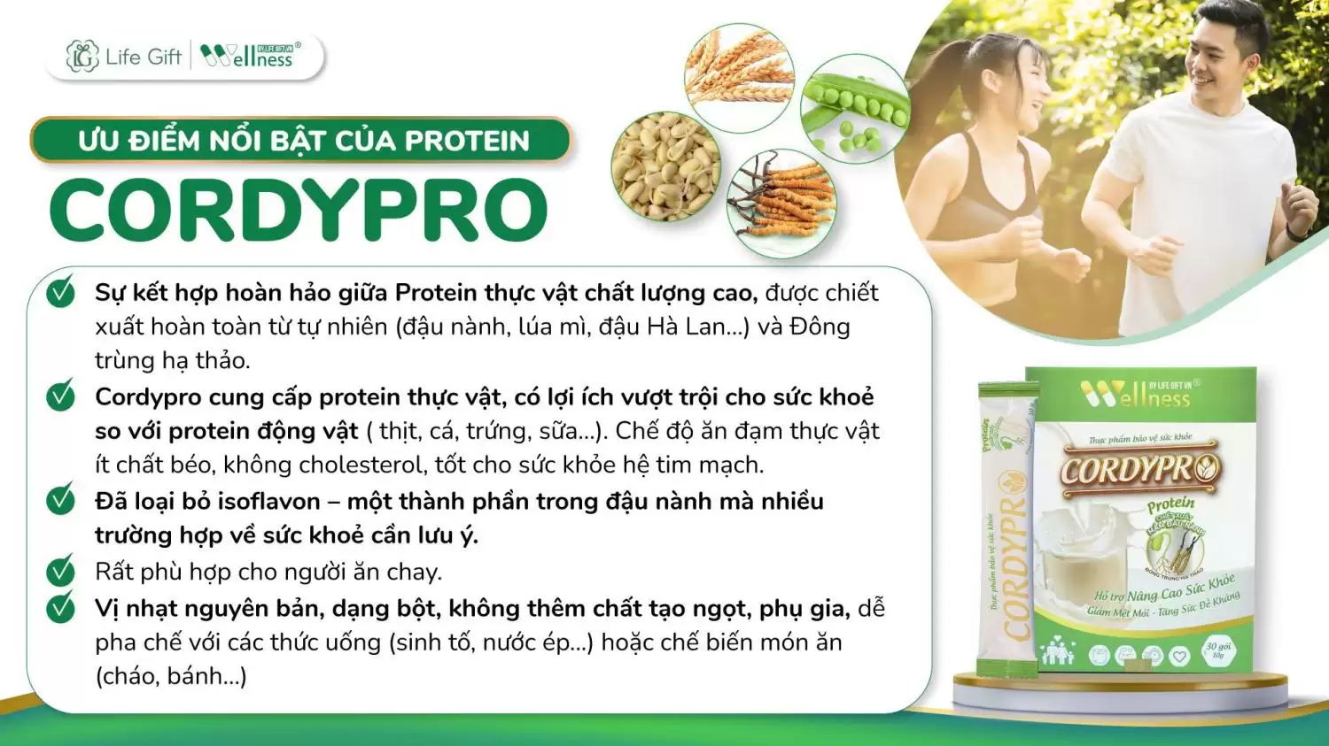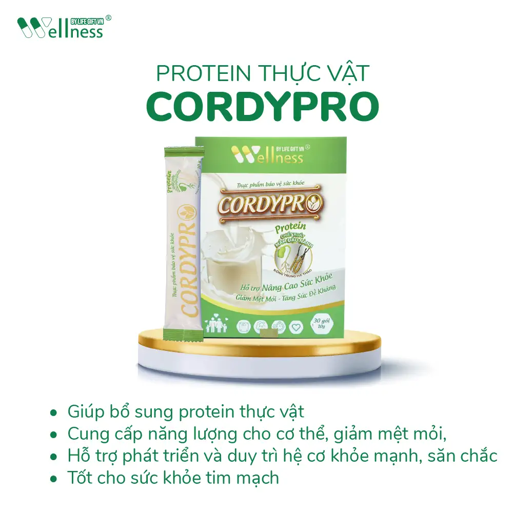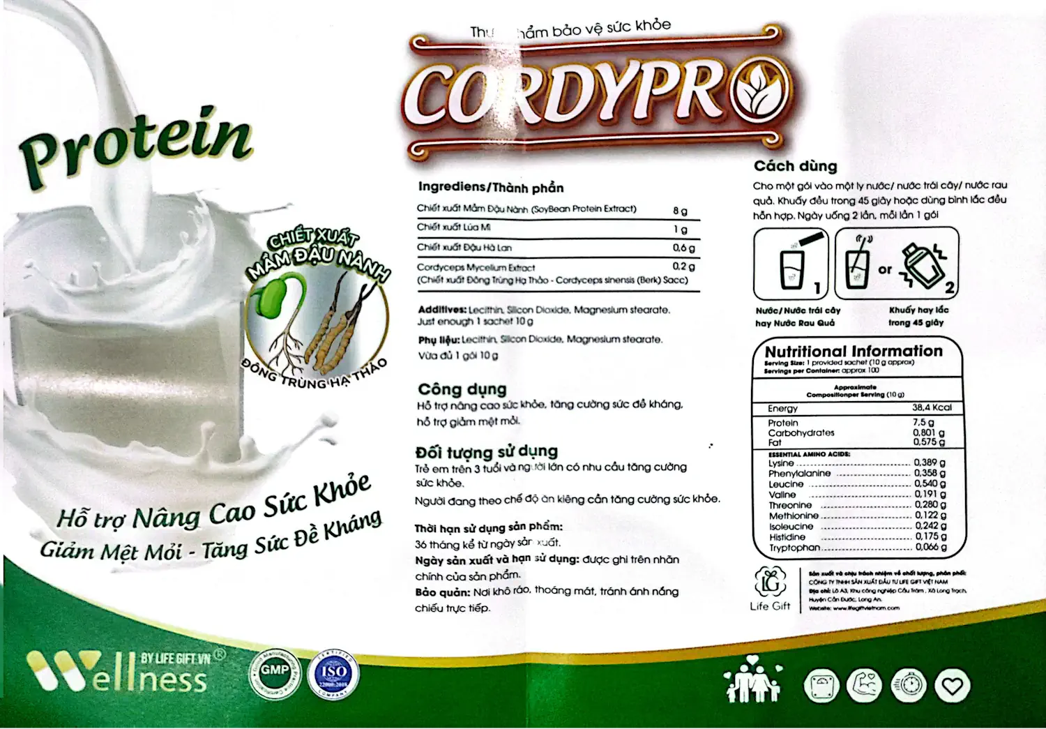 Thực phẩm bổ sung protein thực vật Cordypro: Chiết xuất từ mầm đậu nành, lúa mì, đậu Hà lan, Đông trùng hạ thảo. Hỗ trợ tăng cường sức khoẻ, nâng cao sức đề kháng cho cơ thể, Giảm mệt mỏi (Feedback).