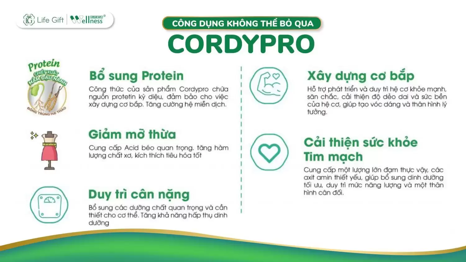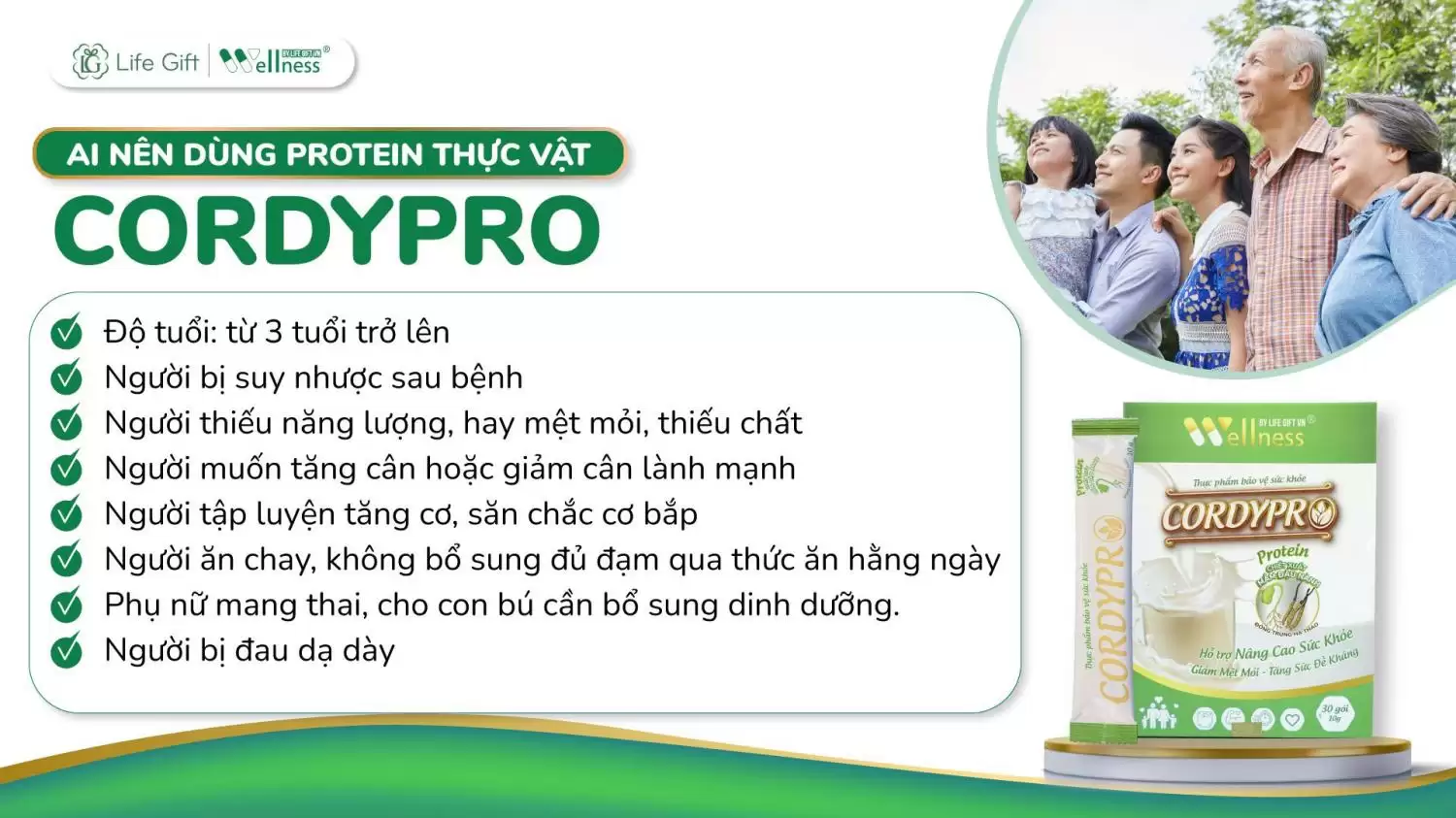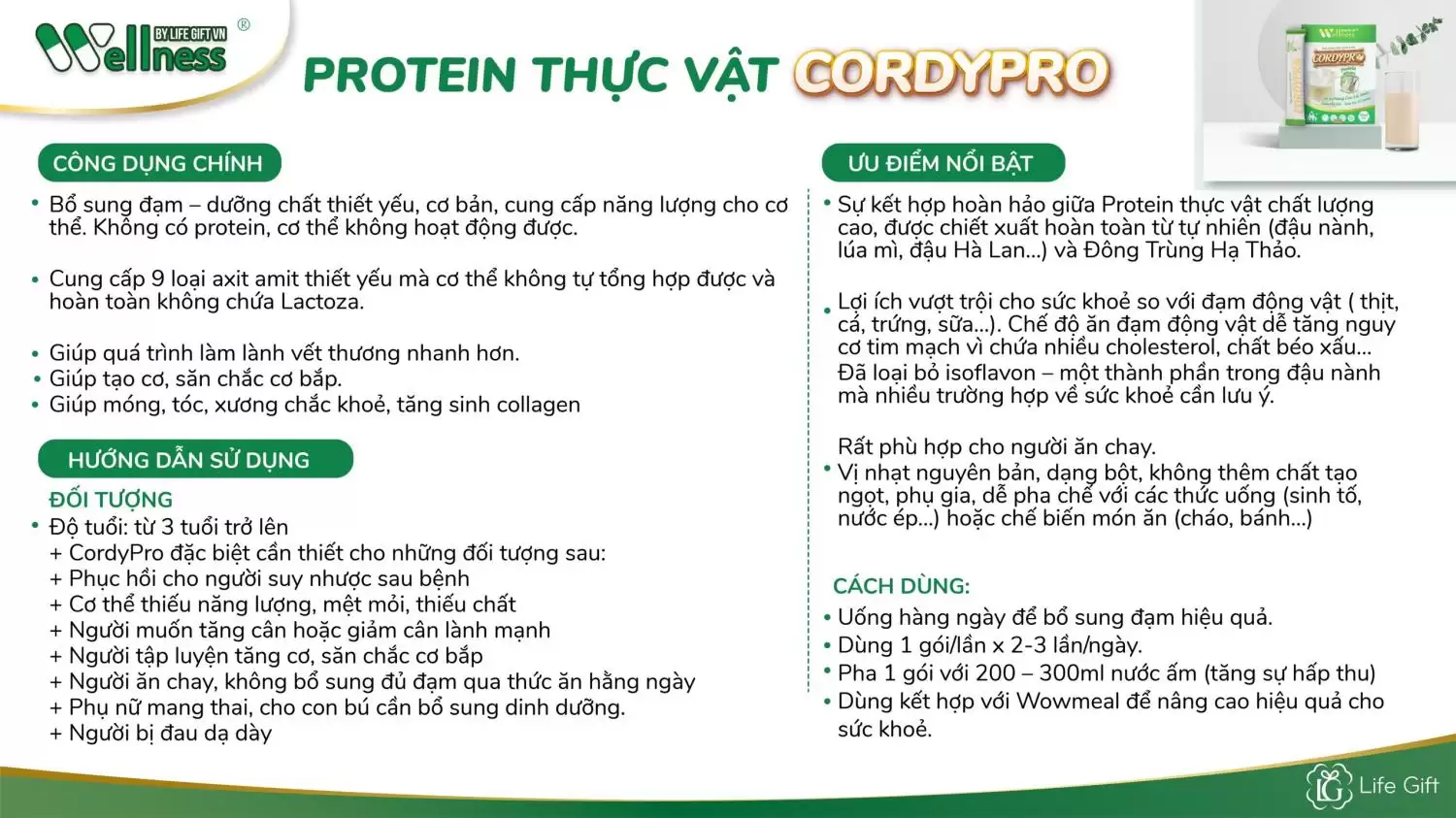 Thực phẩm bổ sung protein thực vật Cordypro: Chiết xuất từ mầm đậu nành, lúa mì, đậu Hà lan, Đông trùng hạ thảo. Hỗ trợ tăng cường sức khoẻ, nâng cao sức đề kháng cho cơ thể, Giảm mệt mỏi (Feedback).
