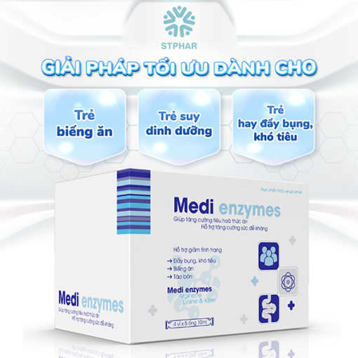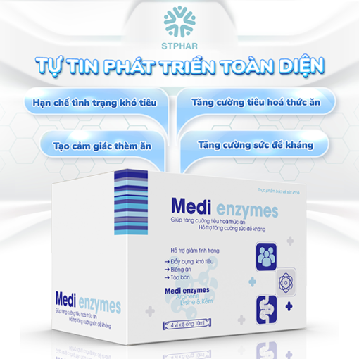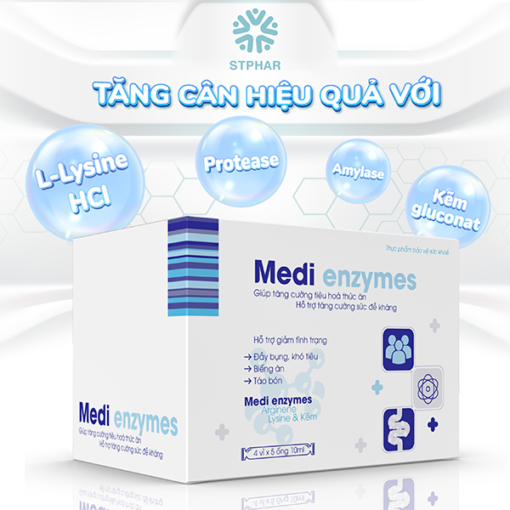 Thực phẩm hỗ trợ tăng cân Medi Enzymes giúp bổ sung enzymes tiêu hóa, giúp hỗ trợ tăng cường tiêu hóa thức ăn. Đặc biệt giảm tình trạng đầy bụng, khó tiêu ở các bé. Tăng cường sức đề kháng cho cơ thể bé.