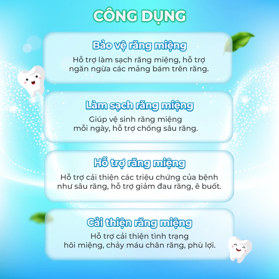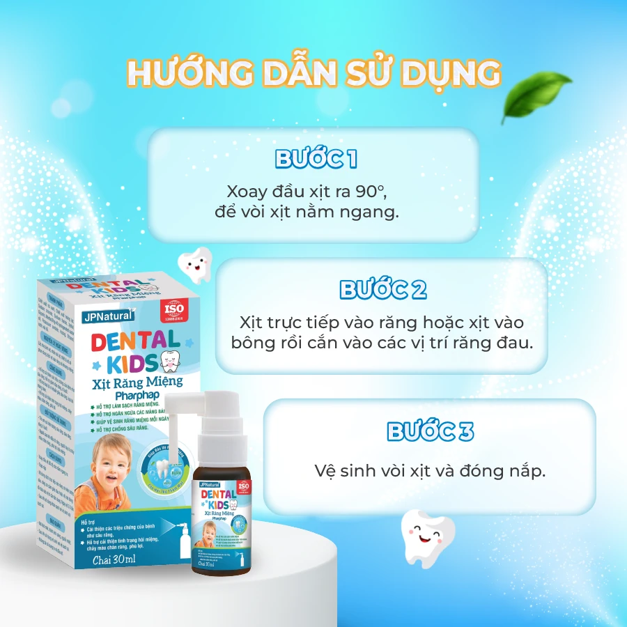 Xịt Răng Miệng PHARPHAP Dental Kids của thương hiệu JP NATURAL (Xuất xứ: Việt Nam) là xịt răng dành cho trẻ em và người có vấn đề về miệng. Công thức chứa chiết xuất từ trà xanh và hoàng lực, cùng với các thành phần khác như sodium fluoride và xylitol, giúp làm sạch răng, ngăn ngừa mảng bám, giảm đau và sâu răng, hôi miệng. Sản phẩm dùng bằng cách xịt trực tiếp lên răng hoặc bông, mỗi ngày 2-3 lần. Bảo quản nơi khô ráo, thoáng mát, tránh ánh sáng và nhiệt.
